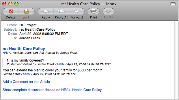 The following examples show notification of a new Article (a "Health Care Policy") followed by a notification that its been edited and a notification about a comment on it.