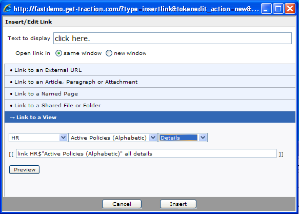 The example below links to the content of the Active Policies section in the HR space. The view volume is Details which will show title, date and author of the articles in the Active Policies section.