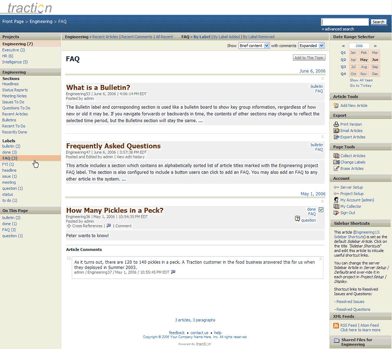 Here's an example showing how tags work. In this case, the FAQ tag in an Engineering space was clicked. You can see that there are three matches. The Add to This Topic button in the upper right makes it easy to add a new article tagged FAQ and it will show up in this area.