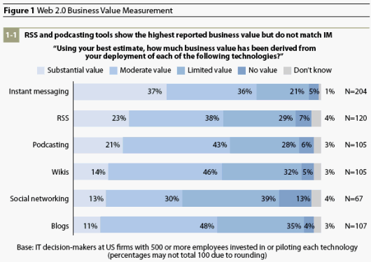 1. All except Social Networking are perceived to have at least "Limited Value" by > 90% and at least "Moderate Value" by > 59%. This may be a strong turn since a few years ago when I'll be the same ratios may have claimed that blog and wiki technology had negative value for the enterprise ;)