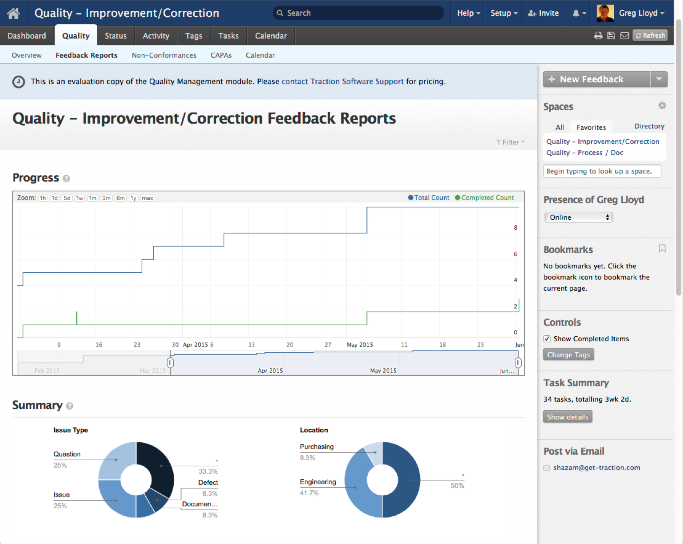 The Quality Management module also adds new Feedback Report, Non-Conformance, and CAPA forms to TeamPage. These Quality forms work like specialized TeamPage tasks, with additional pull down and fill in the blank options used to classify, assign and track Quality related actions. Action tracking, calendar notification, history, search, personal worklist, email digest, and other capabilities work just like they do with standard TeamPage tasks. This enables you to not only track the status of Feedback, Non-Conformance, and CAPA items, but also to use TeamPage collaborative and action tracking capabilities to work with your team to diagnose the problem, come up with a solution, then implement and test the updated procedures - while keeping everyone on the same page. TeamPage streamlines and simplifies the compliance process for everyone.