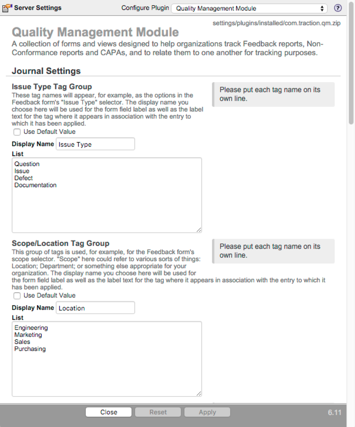 Every organization will want to use its own values for pull down choices like Initiator type, Location and other fields. The Quality Management setup form lets customers who have appropriate permissions fill in their own choices for pull down options as well as selecting template articles that contain the default content for each type of form.