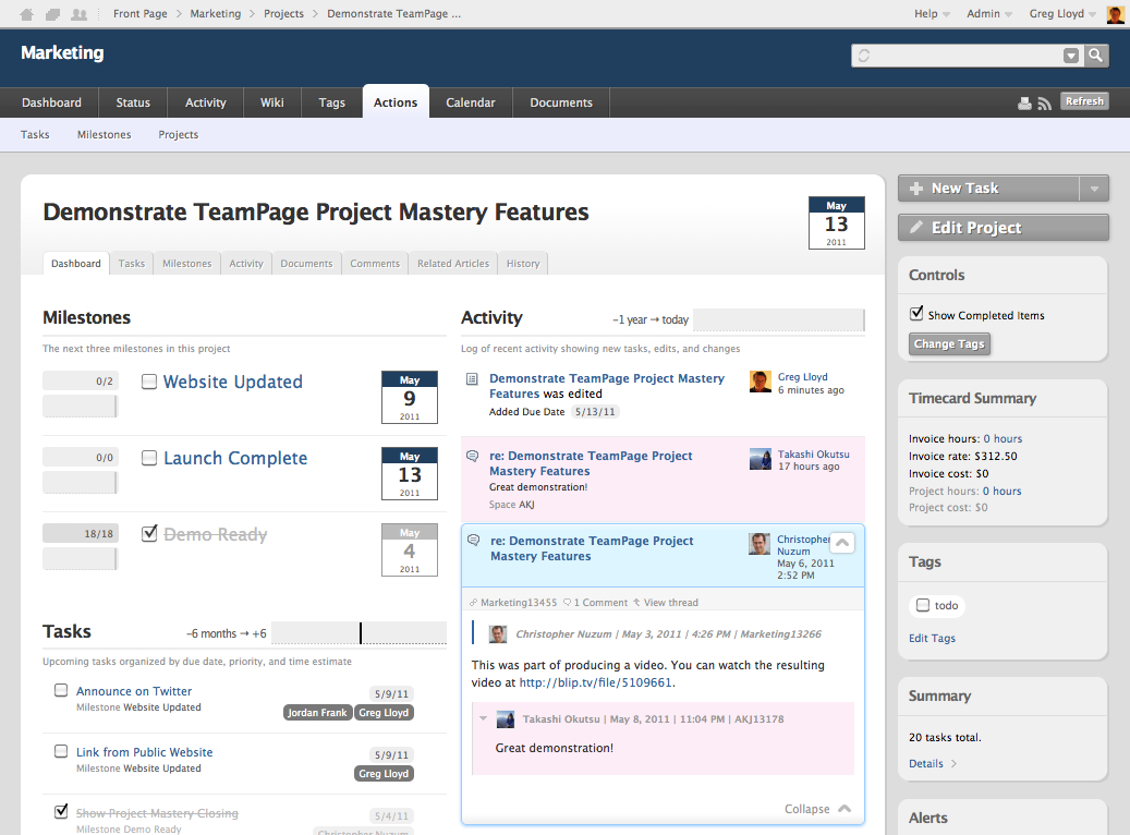 Traction TeamPage Release 5.2 adds mini-dashboards to make it simple to see status, activity, tasks, discussions and related articles or documents focused on a particular project or milestone, complete with sparkline diagrams to see at a glace what's happening over time. Each project, space, and person has an activity stream, making it simple to focus on what you care about - and shift your focus easily.