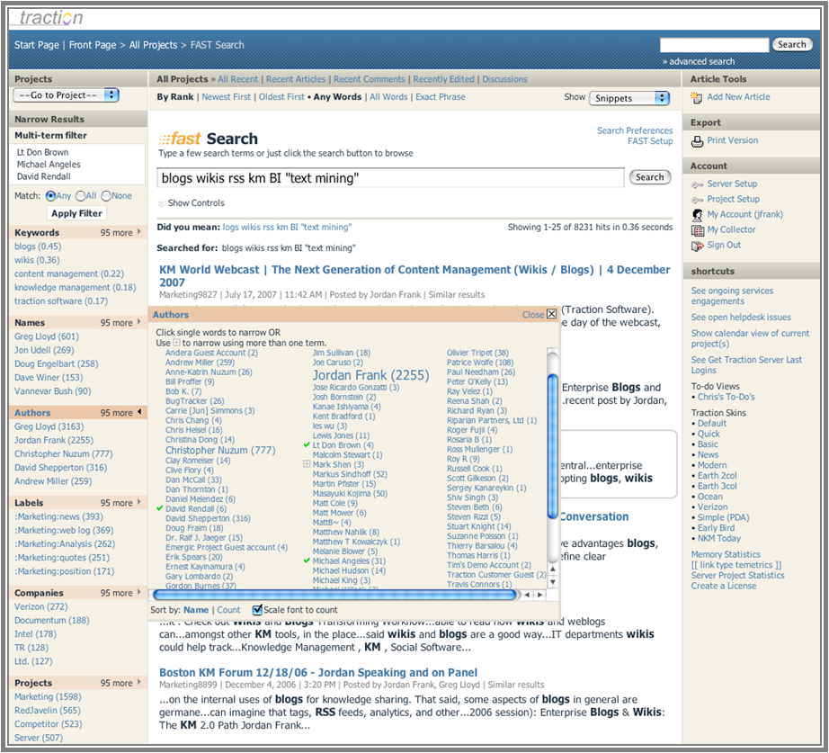 Forgetting the content within, a visual scan of the authors show that Jordan Frank (me) and Greg Lloyd are the apparent authorities on these topics.The backdrop of this result is a server that has around 200,000 potential page, comment and documents as well as several thousand potential authors. And in the top 10 results, I honed in on the two that are, quite likely, the two that one would want to contact with an issue or question. That's a quick way to shorten the search chain!!