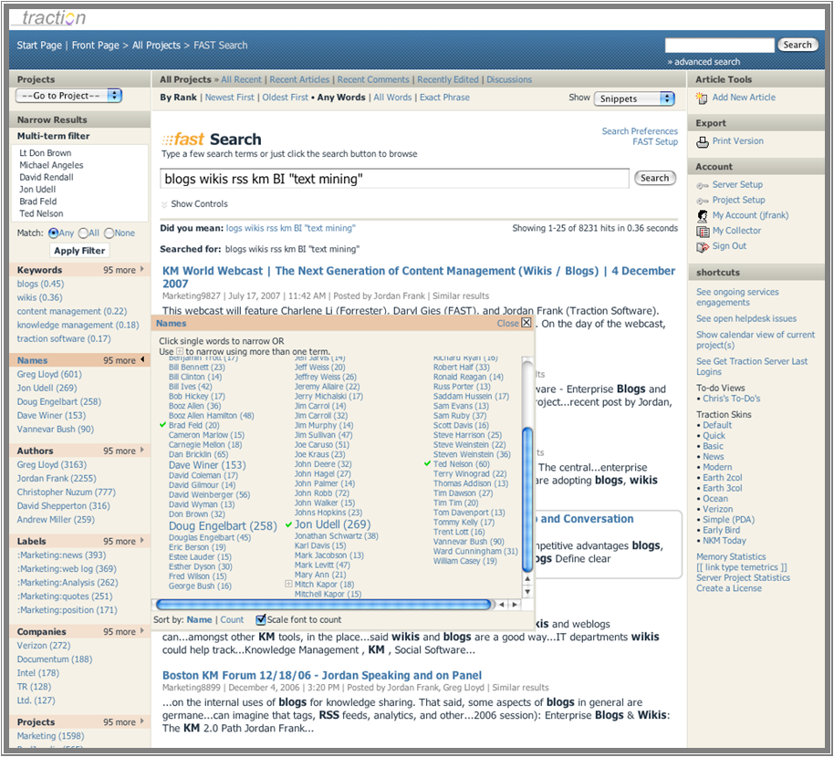 The result shows that, in consideration of these search topics and my permissions, Doug Engelbart is the most referenced industry figure. But, perhaps, I am most interested in the content (and authors) referencing Brad Feld, Ted Nelson and Jon Udell. Multi-select and drill down on that content set will help me figure out what my organization knows about these people, and could also point me to someone that could offer an introduction.