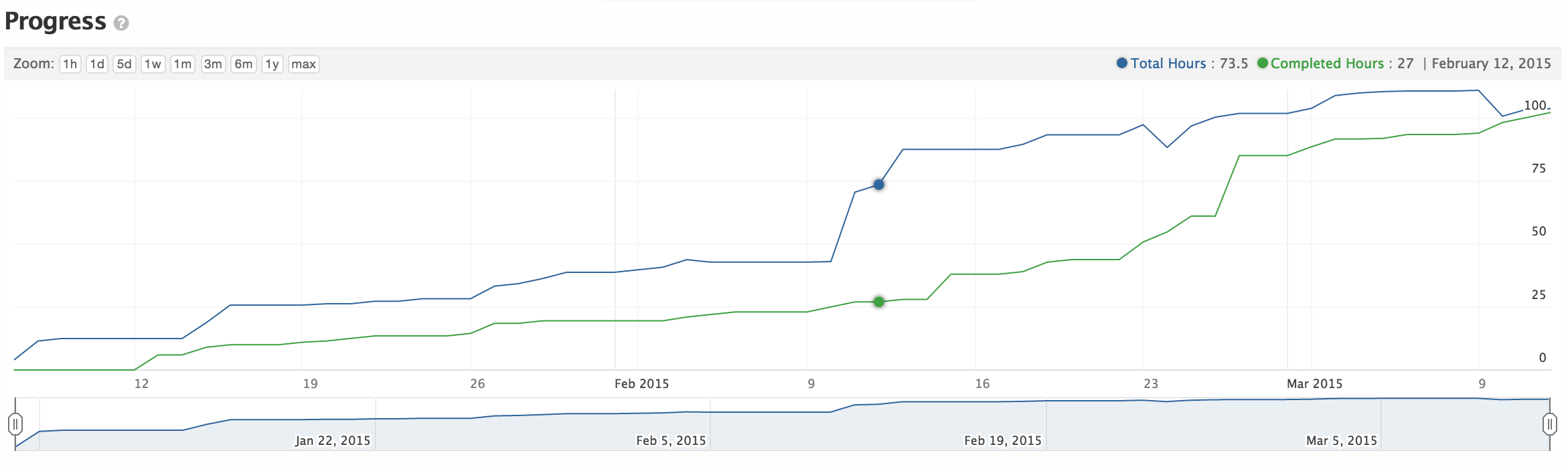 Project and Milestone dashboards now include a Burn-up Chart. A Burn-up Chart tracks the scope of work to be done to complete a Project or Milestone versus time. You can see the rate at which you're making progress, the scope of the work left to do, as well as track any scope changes, see Why I prefer to use burn-up charts for project planning. The chart is based on on the sum of hours for Completed versus Total Tasks associated with that Project or Milestone. The Default Task Estimate for Task hours can now be specified as a Server default as well as a specific number of hours for each Task.
