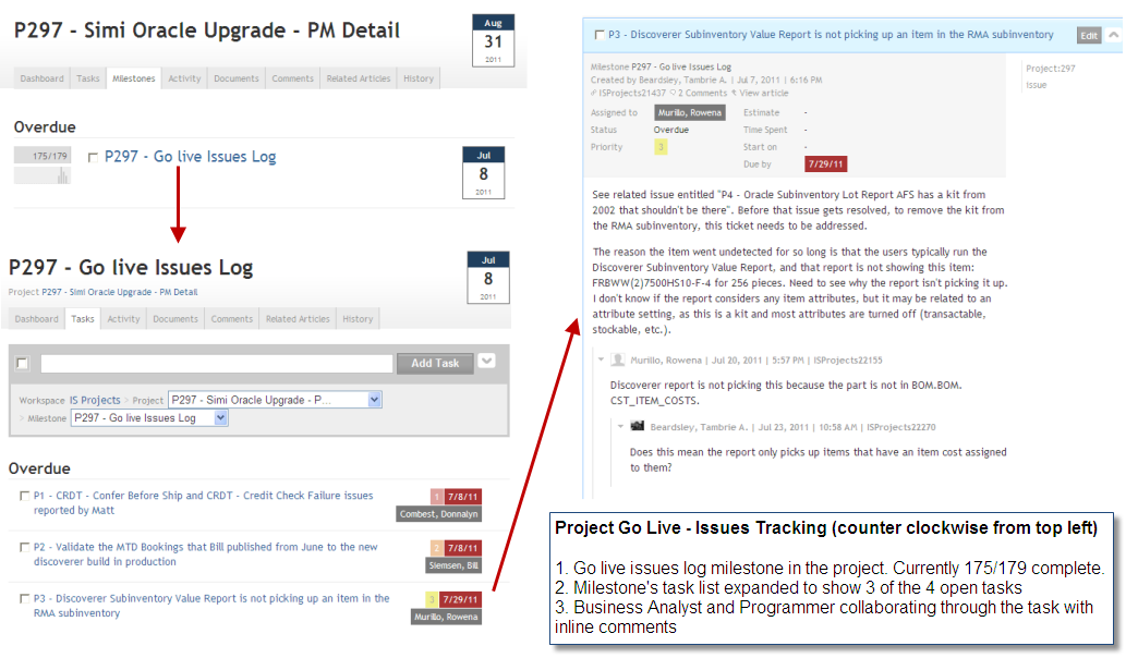 Team members use status updates to identify issues. We make one issue tracking article per day, which resides in the project management workspace. The title of each issue is listed, along with a link to the task. We create a task for each issue. We track these within the go-live milestone on the Oracle upgrade project. We briefly discuss each issue. The goal is to describe the issue and its impact, and then assign who does what and by when.
