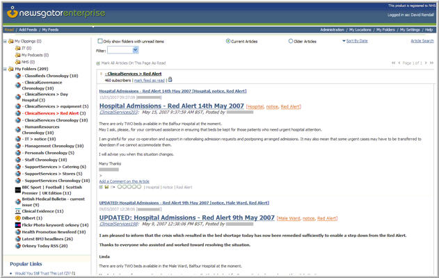 NHS Orkney staff use NewsGator to subscribe to internal feeds from Traction. Traction feeds for the most important tags are provided by default, and users can create their own feed based on any search. In this way, incoming information gets filtered and differentiated before they see it, making at-a-glance prioritization possible.